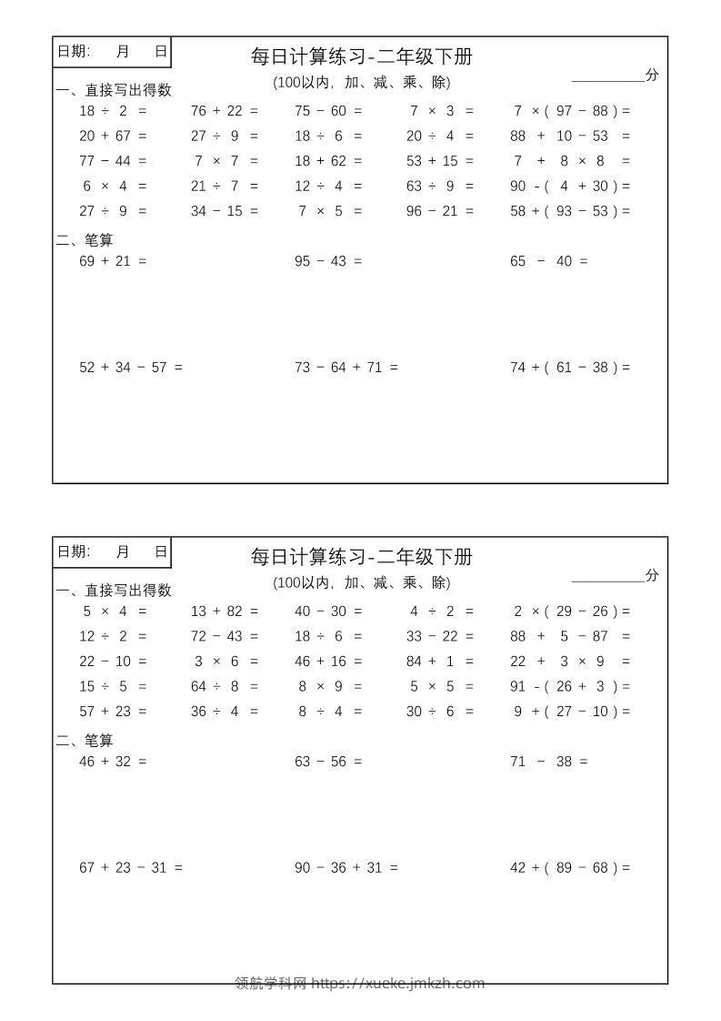 二年级数学100以内加减乘除每日计算练习【计算口算题】青禾老师5个月前发布关注私信055717 ——预览已结束,还剩13页未读——开通会员后可免费下载高清完整文档 二年级数学100以内加减乘除每日计算练习【计算口算题】此内容为付费资源,请付费后查看领航币4.9年度会员免费永久会员免费立即购买您当前未登录!建议登陆后购买,可保存购买订单格式pdf页数15 页大小1.07 MB付费资源© 版权声明 1 本网站名称:领航学科网 2 本站永久网址:https://xueke.jmkzh.com/ 3 本网站的资料都来源于用户投稿,仅供大家学习与参考,如有侵权,请联系站长QQ进行删除处理。 4 本站一切资源不代表本站立场,并不代表本站赞同其观点和对其真实性负责。 5 本站一律禁止以任何方式发布或转载任何违法的相关信息,访客发现请向站长举报! THE END小学数学 喜欢就支持一下吧点赞17 分享QQ空间微博QQ好友海报分享复制链接收藏