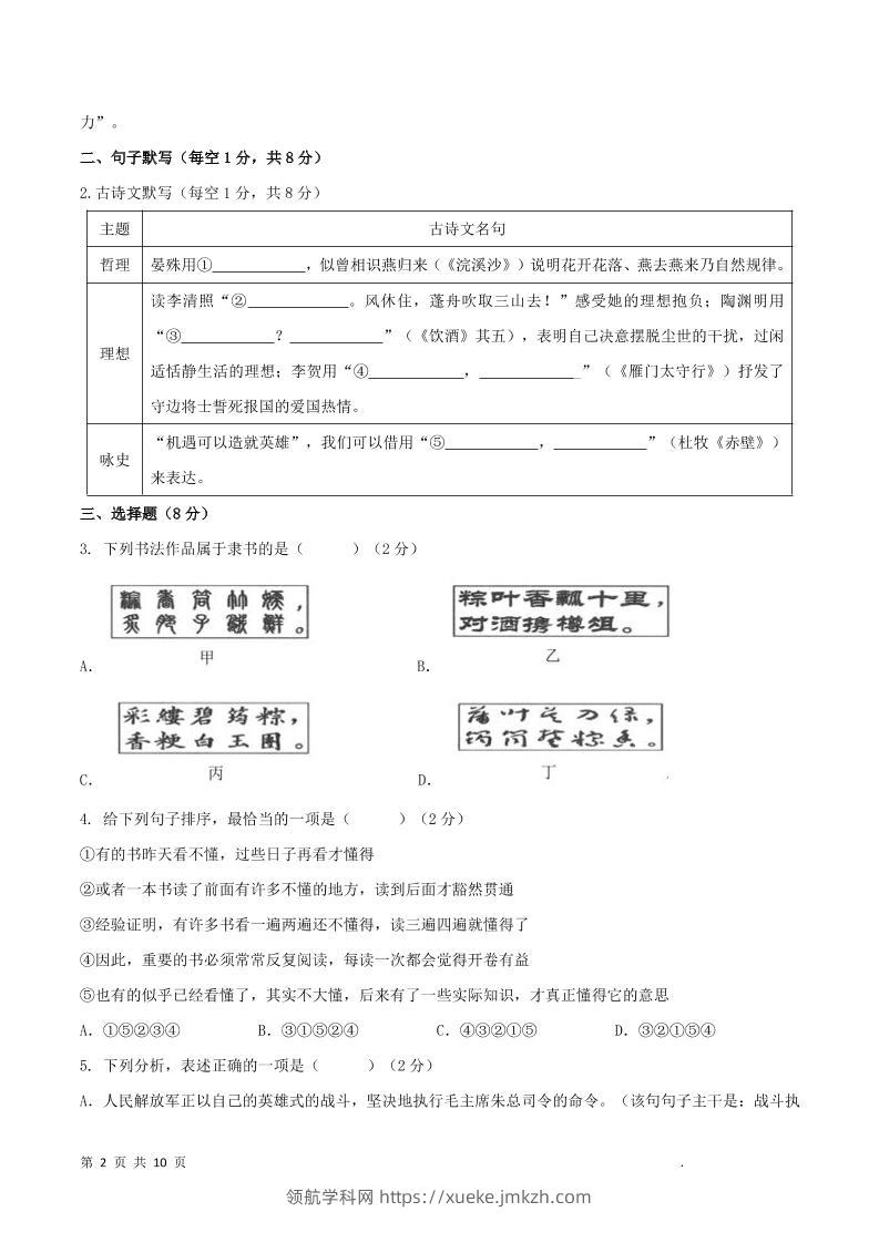 八年级上语文期末测试卷青禾老师10天前发布关注私信074689 ——预览已结束,还剩27页未读——开通会员后可免费下载高清完整文档 八年级上语文期末测试卷此内容为付费资源,请付费后查看领航币4.9年度会员免费永久会员免费立即购买您当前未登录!建议登陆后购买,可保存购买订单格式pdf页数29 页大小1.55 MB付费资源© 版权声明 1 本网站名称:领航学科网 2 本站永久网址:https://xueke.jmkzh.com/ 3 本网站的资料都来源于用户投稿,仅供大家学习与参考,如有侵权,请联系站长QQ进行删除处理。 4 本站一切资源不代表本站立场,并不代表本站赞同其观点和对其真实性负责。 5 本站一律禁止以任何方式发布或转载任何违法的相关信息,访客发现请向站长举报! THE END初中语文 喜欢就支持一下吧点赞89 分享QQ空间微博QQ好友海报分享复制链接收藏