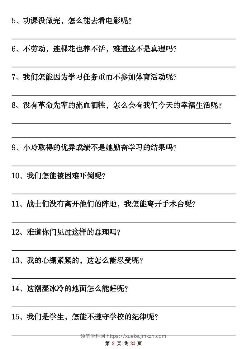 二上语文反问句陈述句转换专项练习100题(含答案20页)青禾老师7天前发布关注私信077398 ——预览已结束,还剩14页未读——开通会员后可免费下载高清完整文档 二上语文反问句陈述句转换专项练习100题(含答案20页)此内容为付费资源,请付费后查看领航币4.9年度会员免费永久会员免费立即购买您当前未登录!建议登陆后购买,可保存购买订单格式pdf页数16 页大小418.63 KB付费资源© 版权声明 1 本网站名称:领航学科网 2 本站永久网址:https://xueke.jmkzh.com/ 3 本网站的资料都来源于用户投稿,仅供大家学习与参考,如有侵权,请联系站长QQ进行删除处理。 4 本站一切资源不代表本站立场,并不代表本站赞同其观点和对其真实性负责。 5 本站一律禁止以任何方式发布或转载任何违法的相关信息,访客发现请向站长举报! THE END小学语文 喜欢就支持一下吧点赞98 分享QQ空间微博QQ好友海报分享复制链接收藏