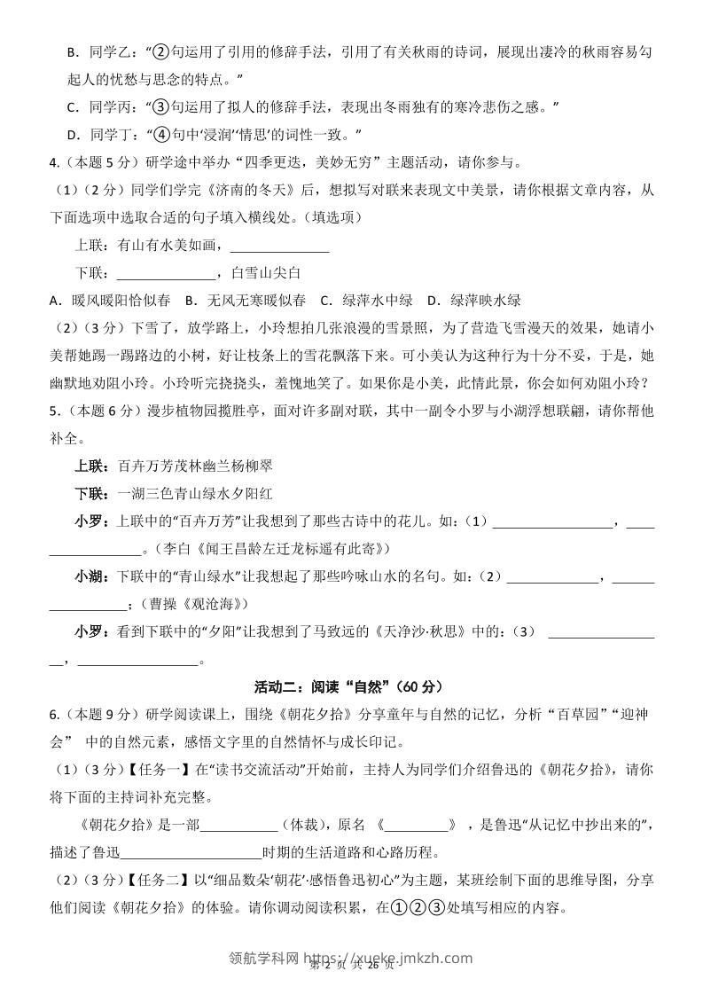 七年级上语文第1次月考卷01青禾老师4个月前发布关注私信0791100 ——预览已结束,还剩24页未读——开通会员后可免费下载高清完整文档 七年级上语文第1次月考卷01此内容为付费资源,请付费后查看领航币4.9年度会员免费永久会员免费立即购买您当前未登录!建议登陆后购买,可保存购买订单格式pdf页数26 页大小1.33 MB付费资源© 版权声明 1 本网站名称:领航学科网 2 本站永久网址:https://xueke.jmkzh.com/ 3 本网站的资料都来源于用户投稿,仅供大家学习与参考,如有侵权,请联系站长QQ进行删除处理。 4 本站一切资源不代表本站立场,并不代表本站赞同其观点和对其真实性负责。 5 本站一律禁止以任何方式发布或转载任何违法的相关信息,访客发现请向站长举报! THE END初中语文 喜欢就支持一下吧点赞100 分享QQ空间微博QQ好友海报分享复制链接收藏