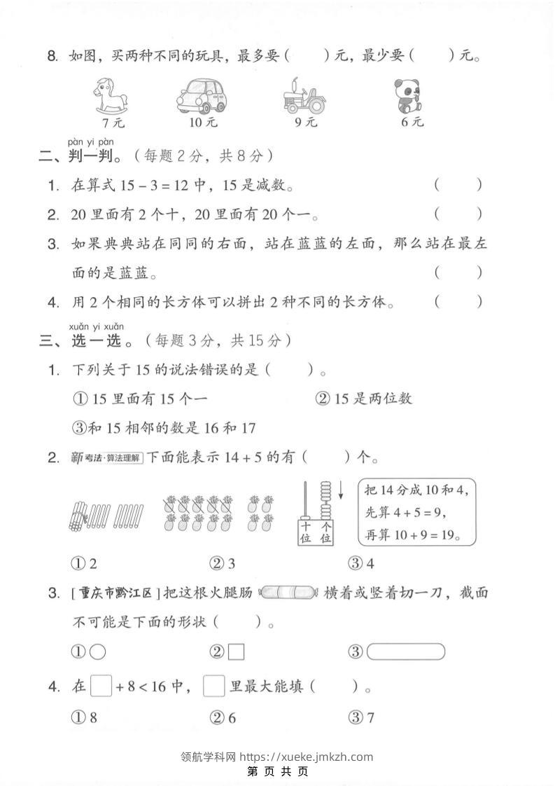 一年级上数学期末模拟测试卷1《西师版》青禾老师13天前发布关注私信060314 ——预览已结束,还剩3页未读——开通会员后可免费下载高清完整文档 一年级上数学期末模拟测试卷1《西师版》此内容为付费资源,请付费后查看领航币4.9年度会员免费永久会员免费立即购买您当前未登录!建议登陆后购买,可保存购买订单格式pdf页数5 页大小3.63 MB付费资源© 版权声明 1 本网站名称:领航学科网 2 本站永久网址:https://xueke.jmkzh.com/ 3 本网站的资料都来源于用户投稿,仅供大家学习与参考,如有侵权,请联系站长QQ进行删除处理。 4 本站一切资源不代表本站立场,并不代表本站赞同其观点和对其真实性负责。 5 本站一律禁止以任何方式发布或转载任何违法的相关信息,访客发现请向站长举报! THE END小学数学 喜欢就支持一下吧点赞14 分享QQ空间微博QQ好友海报分享复制链接收藏