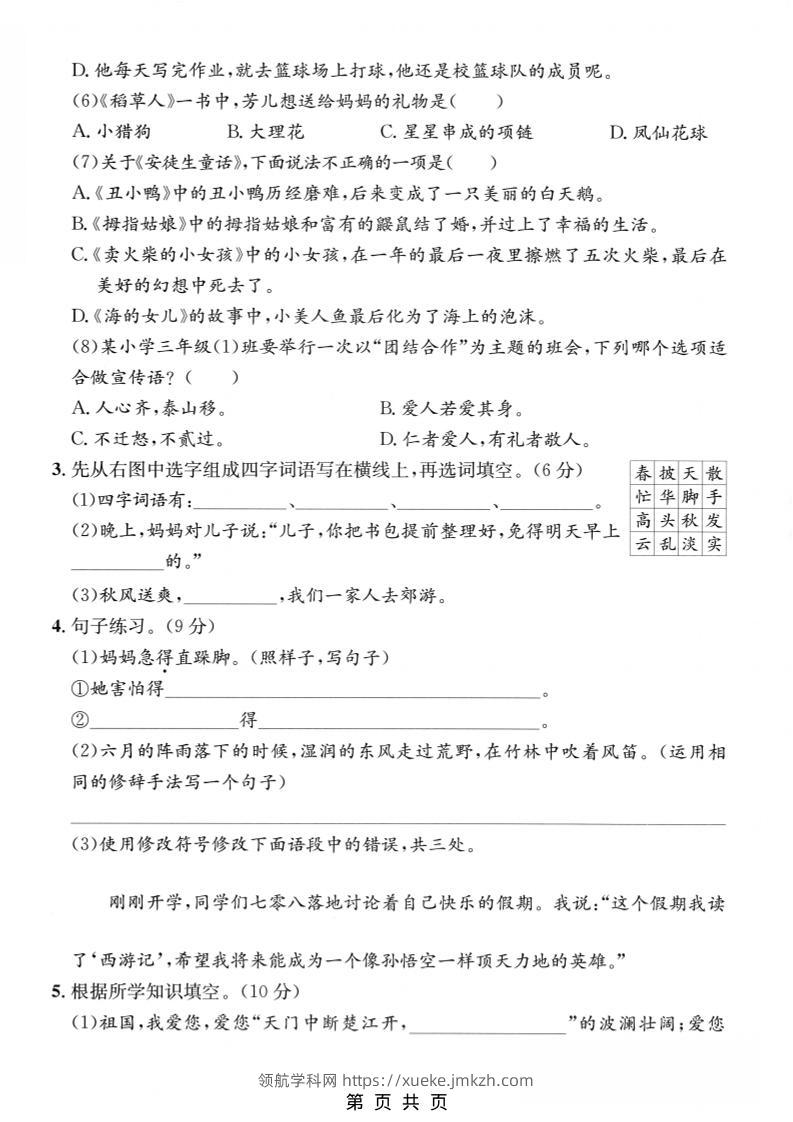 三年级上语文期末押题测试卷1青禾老师2个月前发布关注私信035234 ——预览已结束,还剩3页未读——开通会员后可免费下载高清完整文档 三年级上语文期末押题测试卷1此内容为付费资源,请付费后查看领航币4.9年度会员免费永久会员免费立即购买您当前未登录!建议登陆后购买,可保存购买订单格式pdf页数5 页大小4.29 MB付费资源© 版权声明 1 本网站名称:领航学科网 2 本站永久网址:https://xueke.jmkzh.com/ 3 本网站的资料都来源于用户投稿,仅供大家学习与参考,如有侵权,请联系站长QQ进行删除处理。 4 本站一切资源不代表本站立场,并不代表本站赞同其观点和对其真实性负责。 5 本站一律禁止以任何方式发布或转载任何违法的相关信息,访客发现请向站长举报! THE END小学语文 喜欢就支持一下吧点赞34 分享QQ空间微博QQ好友海报分享复制链接收藏