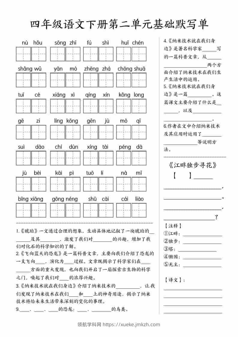 四年级下语文基础默写单(1-8单元)青禾老师1个月前发布关注私信07818 ——预览已结束,还剩6页未读——开通会员后可免费下载高清完整文档 四年级下语文基础默写单(1-8单元)此内容为付费资源,请付费后查看领航币4.9年度会员免费永久会员免费立即购买您当前未登录!建议登陆后购买,可保存购买订单格式pdf页数8 页大小1.75 MB付费资源© 版权声明 1 本网站名称:领航学科网 2 本站永久网址:https://xueke.jmkzh.com/ 3 本网站的资料都来源于用户投稿,仅供大家学习与参考,如有侵权,请联系站长QQ进行删除处理。 4 本站一切资源不代表本站立场,并不代表本站赞同其观点和对其真实性负责。 5 本站一律禁止以任何方式发布或转载任何违法的相关信息,访客发现请向站长举报! THE END小学语文 喜欢就支持一下吧点赞18 分享QQ空间微博QQ好友海报分享复制链接收藏