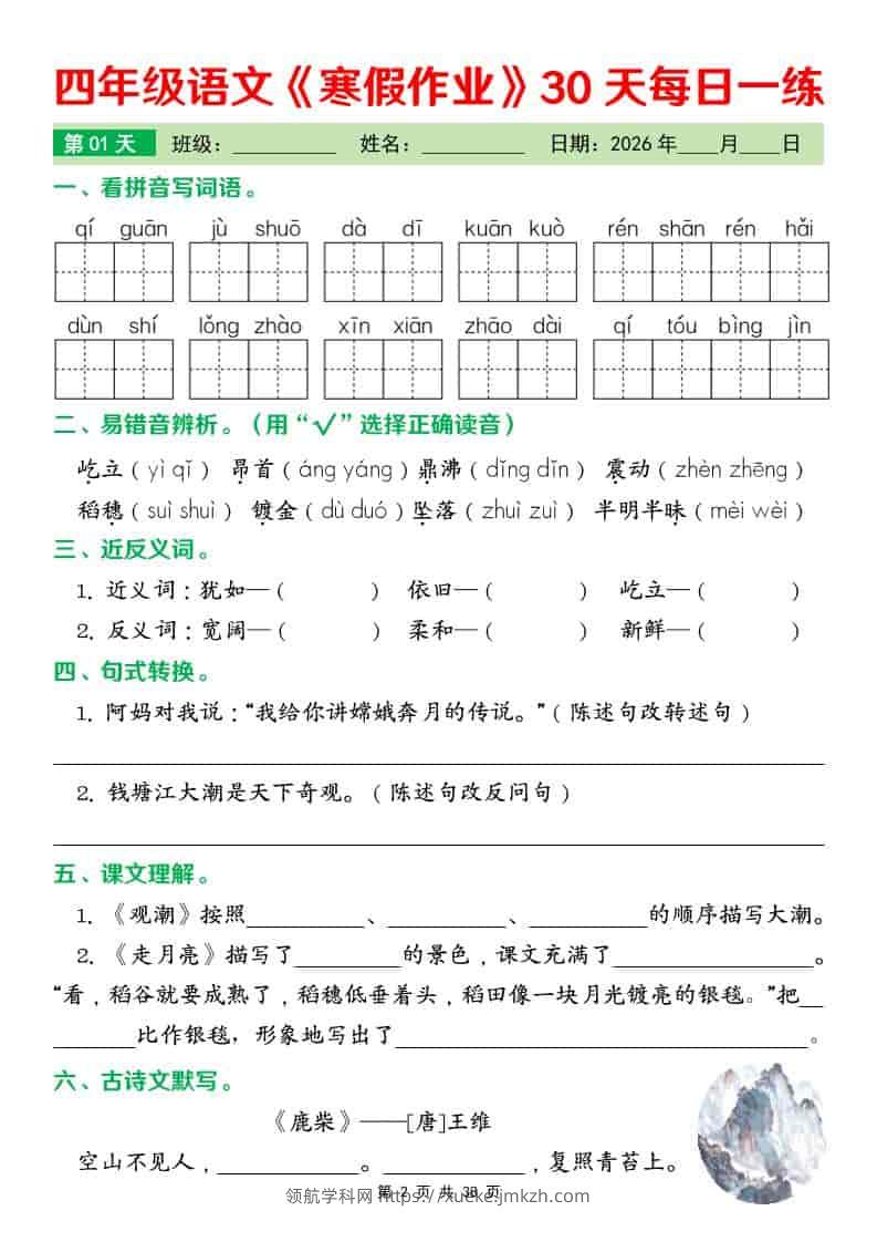 四年级下语文寒假作业每日一练30天青禾老师1个月前发布关注私信07446 ——预览已结束,还剩36页未读——开通会员后可免费下载高清完整文档 四年级下语文寒假作业每日一练30天此内容为付费资源,请付费后查看领航币4.9年度会员免费永久会员免费立即购买您当前未登录!建议登陆后购买,可保存购买订单格式pdf页数38 页大小3.92 MB付费资源© 版权声明 1 本网站名称:领航学科网 2 本站永久网址:https://xueke.jmkzh.com/ 3 本网站的资料都来源于用户投稿,仅供大家学习与参考,如有侵权,请联系站长QQ进行删除处理。 4 本站一切资源不代表本站立场,并不代表本站赞同其观点和对其真实性负责。 5 本站一律禁止以任何方式发布或转载任何违法的相关信息,访客发现请向站长举报! THE END小学语文 喜欢就支持一下吧点赞6 分享QQ空间微博QQ好友海报分享复制链接收藏
