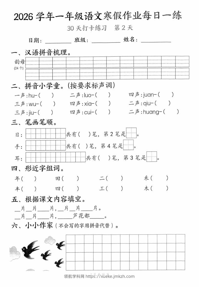 26学年一年级语文下寒假作业每日一练30天(30页)青禾老师1个月前发布关注私信051743 ——预览已结束,还剩28页未读——开通会员后可免费下载高清完整文档 26学年一年级语文下寒假作业每日一练30天(30页)此内容为付费资源,请付费后查看领航币4.9年度会员免费永久会员免费立即购买您当前未登录!建议登陆后购买,可保存购买订单格式pdf页数30 页大小12.79 MB付费资源© 版权声明 1 本网站名称:领航学科网 2 本站永久网址:https://xueke.jmkzh.com/ 3 本网站的资料都来源于用户投稿,仅供大家学习与参考,如有侵权,请联系站长QQ进行删除处理。 4 本站一切资源不代表本站立场,并不代表本站赞同其观点和对其真实性负责。 5 本站一律禁止以任何方式发布或转载任何违法的相关信息,访客发现请向站长举报! THE END小学语文 喜欢就支持一下吧点赞43 分享QQ空间微博QQ好友海报分享复制链接收藏