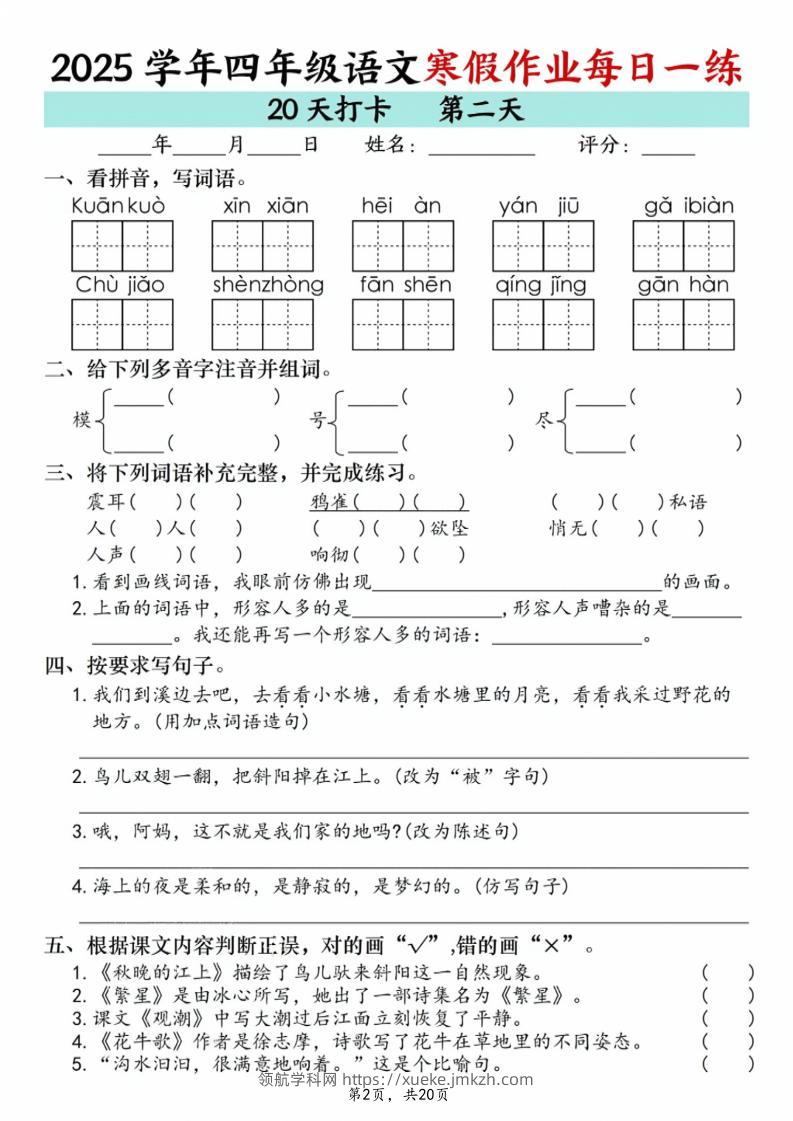 四年级语文下寒假作业每日一练20天(20页)青禾老师1个月前发布关注私信03614 ——预览已结束,还剩18页未读——开通会员后可免费下载高清完整文档 四年级语文下寒假作业每日一练20天(20页)此内容为付费资源,请付费后查看领航币4.9年度会员免费永久会员免费立即购买您当前未登录!建议登陆后购买,可保存购买订单格式pdf页数20 页大小7.22 MB付费资源© 版权声明 1 本网站名称:领航学科网 2 本站永久网址:https://xueke.jmkzh.com/ 3 本网站的资料都来源于用户投稿,仅供大家学习与参考,如有侵权,请联系站长QQ进行删除处理。 4 本站一切资源不代表本站立场,并不代表本站赞同其观点和对其真实性负责。 5 本站一律禁止以任何方式发布或转载任何违法的相关信息,访客发现请向站长举报! THE END小学语文 喜欢就支持一下吧点赞14 分享QQ空间微博QQ好友海报分享复制链接收藏