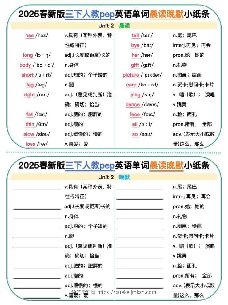三年级下英语单词晨读晚默小纸条《人教PEP》青禾老师37天前发布关注私信07983 ——预览已结束,还剩4页未读——开通会员后可免费下载高清完整文档 三年级下英语单词晨读晚默小纸条《人教PEP》此内容为付费资源,请付费后查看领航币4.9年度会员免费永久会员免费立即购买您当前未登录!建议登陆后购买,可保存购买订单格式pdf页数6 页大小285.18 KB付费资源© 版权声明 1 本网站名称:领航学科网 2 本站永久网址:https://xueke.jmkzh.com/ 3 本网站的资料都来源于用户投稿,仅供大家学习与参考,如有侵权,请联系站长QQ进行删除处理。 4 本站一切资源不代表本站立场,并不代表本站赞同其观点和对其真实性负责。 5 本站一律禁止以任何方式发布或转载任何违法的相关信息,访客发现请向站长举报! THE END小学英语 喜欢就支持一下吧点赞83 分享QQ空间微博QQ好友海报分享复制链接收藏