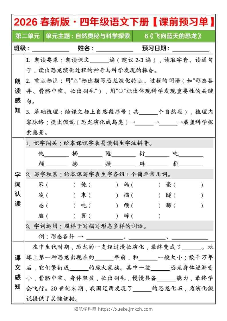 四年级下语文26春第二单元课前预习单青禾老师22天前发布关注私信083739 ——预览已结束,还剩3页未读——开通会员后可免费下载高清完整文档 四年级下语文26春第二单元课前预习单此内容为付费资源,请付费后查看领航币4.9年度会员免费永久会员免费立即购买您当前未登录!建议登陆后购买,可保存购买订单格式pdf页数5 页大小584.62 KB付费资源© 版权声明 1 本网站名称:领航学科网 2 本站永久网址:https://xueke.jmkzh.com/ 3 本网站的资料都来源于用户投稿,仅供大家学习与参考,如有侵权,请联系站长QQ进行删除处理。 4 本站一切资源不代表本站立场,并不代表本站赞同其观点和对其真实性负责。 5 本站一律禁止以任何方式发布或转载任何违法的相关信息,访客发现请向站长举报! THE END小学语文 喜欢就支持一下吧点赞39 分享QQ空间微博QQ好友海报分享复制链接收藏
