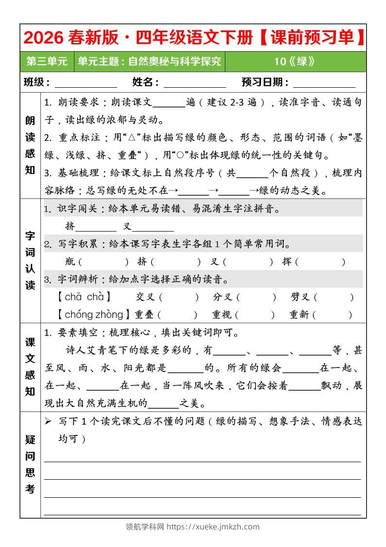 四年级下语文26春第三单元课前预习单青禾老师7天前发布关注私信094861 ——预览已结束,还剩3页未读——开通会员后可免费下载高清完整文档 四年级下语文26春第三单元课前预习单此内容为付费资源,请付费后查看领航币4.9年度会员免费永久会员免费立即购买您当前未登录!建议登陆后购买,可保存购买订单格式pdf页数5 页大小603.27 KB付费资源© 版权声明 1 本网站名称:领航学科网 2 本站永久网址:https://xueke.jmkzh.com/ 3 本网站的资料都来源于用户投稿,仅供大家学习与参考,如有侵权,请联系站长QQ进行删除处理。 4 本站一切资源不代表本站立场,并不代表本站赞同其观点和对其真实性负责。 5 本站一律禁止以任何方式发布或转载任何违法的相关信息,访客发现请向站长举报! THE END小学语文 喜欢就支持一下吧点赞61 分享QQ空间微博QQ好友海报分享复制链接收藏