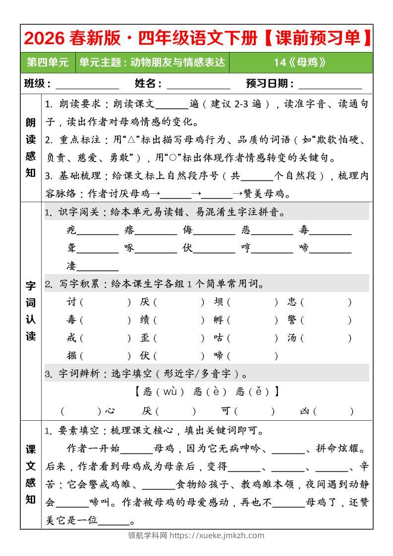 四年级下语文26春第四单元课前预习单青禾老师6天前发布关注私信038951 ——预览已结束,还剩2页未读——开通会员后可免费下载高清完整文档 四年级下语文26春第四单元课前预习单此内容为付费资源,请付费后查看领航币4.9年度会员免费永久会员免费立即购买您当前未登录!建议登陆后购买,可保存购买订单格式pdf页数4 页大小613.01 KB付费资源© 版权声明 1 本网站名称:领航学科网 2 本站永久网址:https://xueke.jmkzh.com/ 3 本网站的资料都来源于用户投稿,仅供大家学习与参考,如有侵权,请联系站长QQ进行删除处理。 4 本站一切资源不代表本站立场,并不代表本站赞同其观点和对其真实性负责。 5 本站一律禁止以任何方式发布或转载任何违法的相关信息,访客发现请向站长举报! THE END小学语文 喜欢就支持一下吧点赞51 分享QQ空间微博QQ好友海报分享复制链接收藏