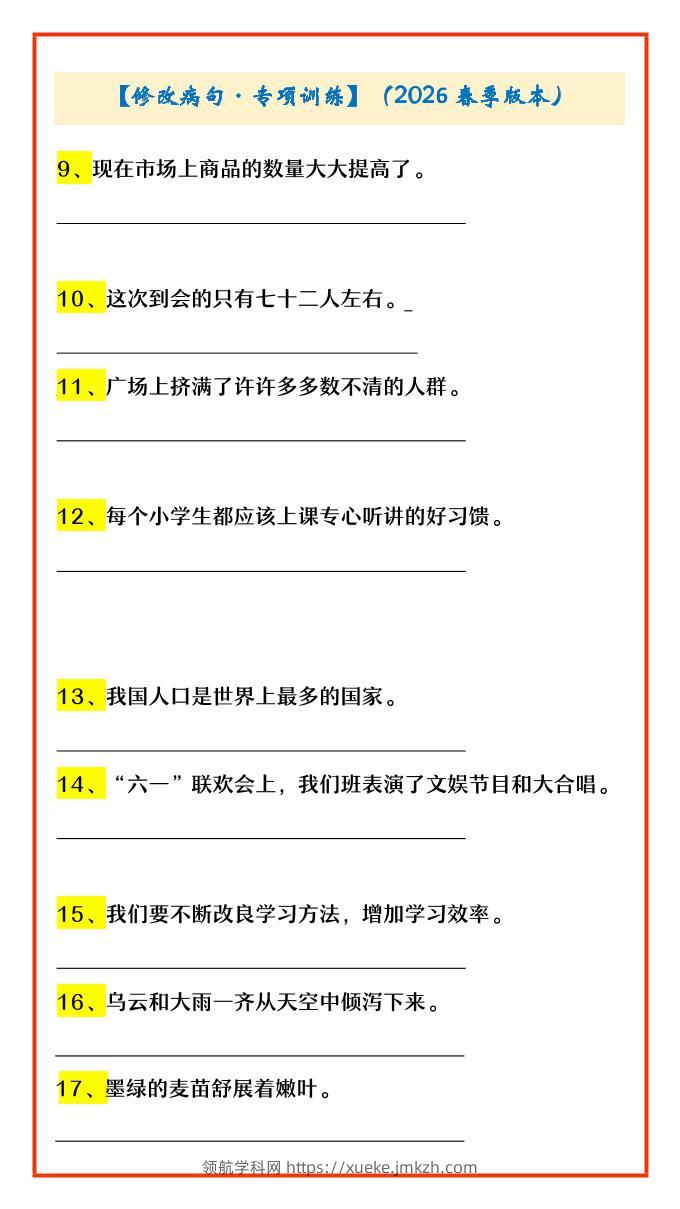 四年级下语文修改病句·专项训练青禾老师昨天发布关注私信01007 ——预览已结束,还剩2页未读——开通会员后可免费下载高清完整文档 四年级下语文修改病句·专项训练此内容为付费资源,请付费后查看领航币4.9年度会员免费永久会员免费立即购买您当前未登录!建议登陆后购买,可保存购买订单格式pdf页数4 页大小200.95 KB付费资源© 版权声明 1 本网站名称:领航学科网 2 本站永久网址:https://xueke.jmkzh.com/ 3 本网站的资料都来源于用户投稿,仅供大家学习与参考,如有侵权,请联系站长QQ进行删除处理。 4 本站一切资源不代表本站立场,并不代表本站赞同其观点和对其真实性负责。 5 本站一律禁止以任何方式发布或转载任何违法的相关信息,访客发现请向站长举报! THE END小学语文 喜欢就支持一下吧点赞7 分享QQ空间微博QQ好友海报分享复制链接收藏